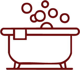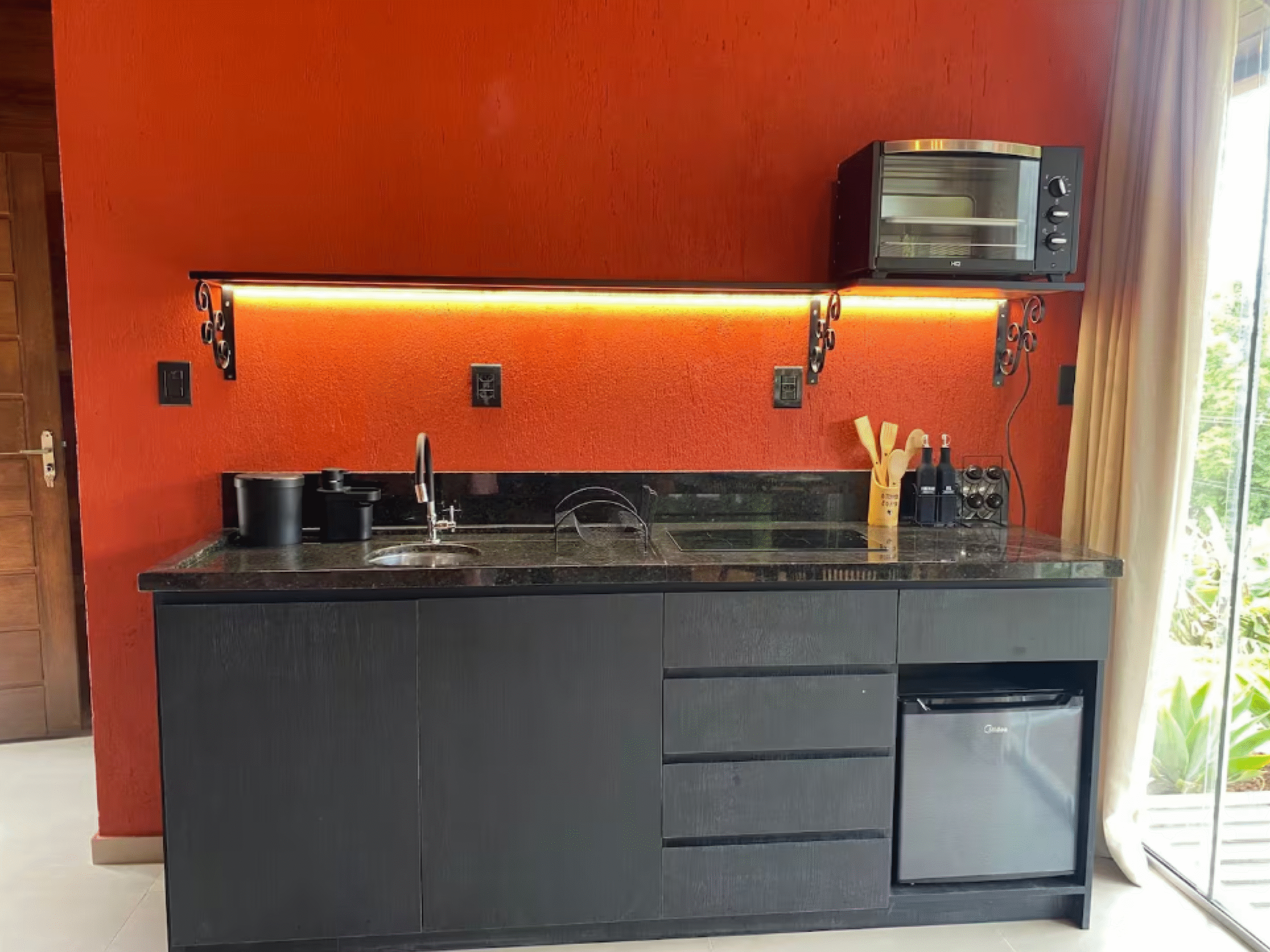 O Chalé Fogo tem banheira interna, cor predominante vermelha e um destaque especial: é totalmente acessível, garantindo conforto para hóspedes com mobilidade reduzida.