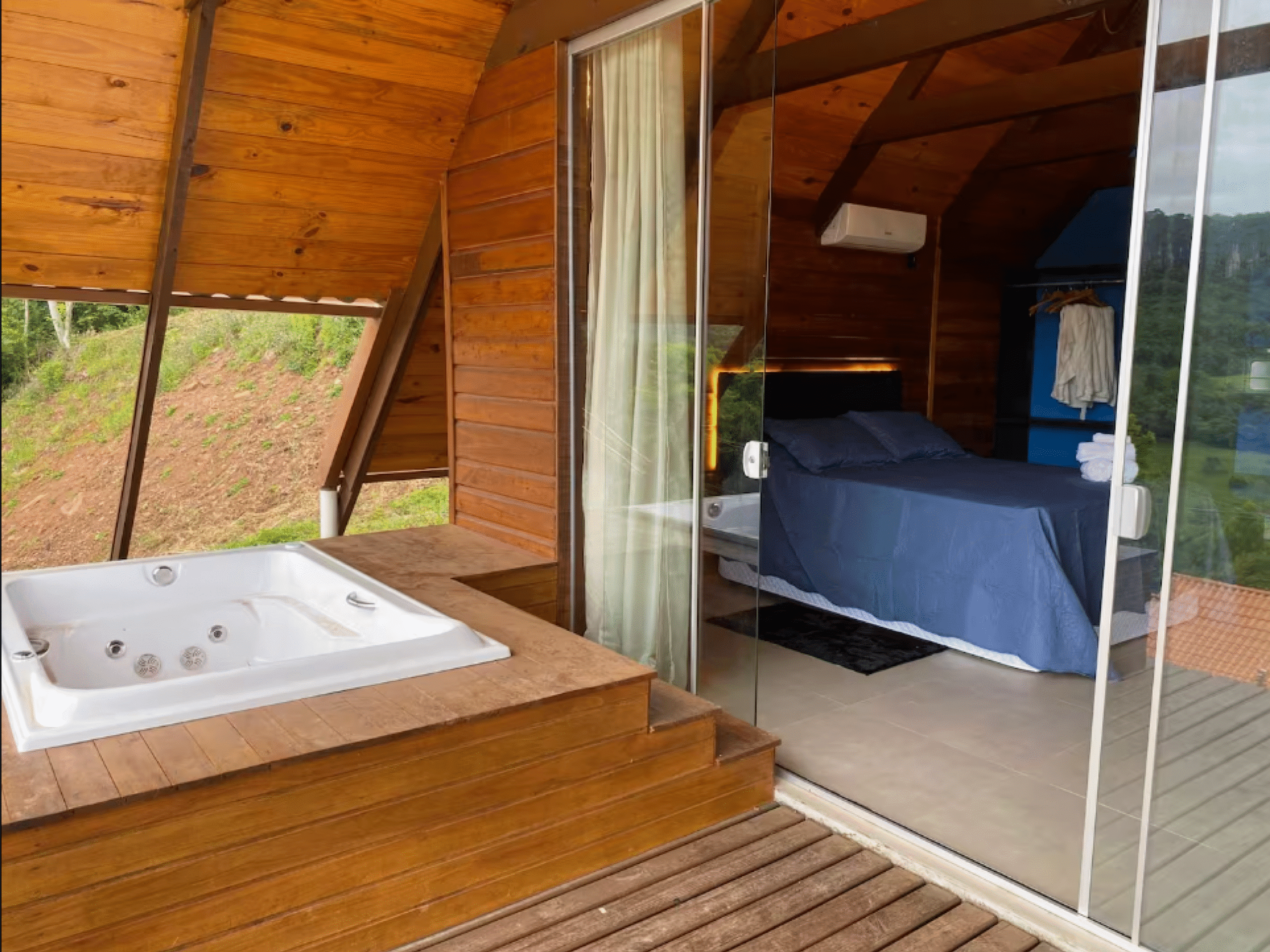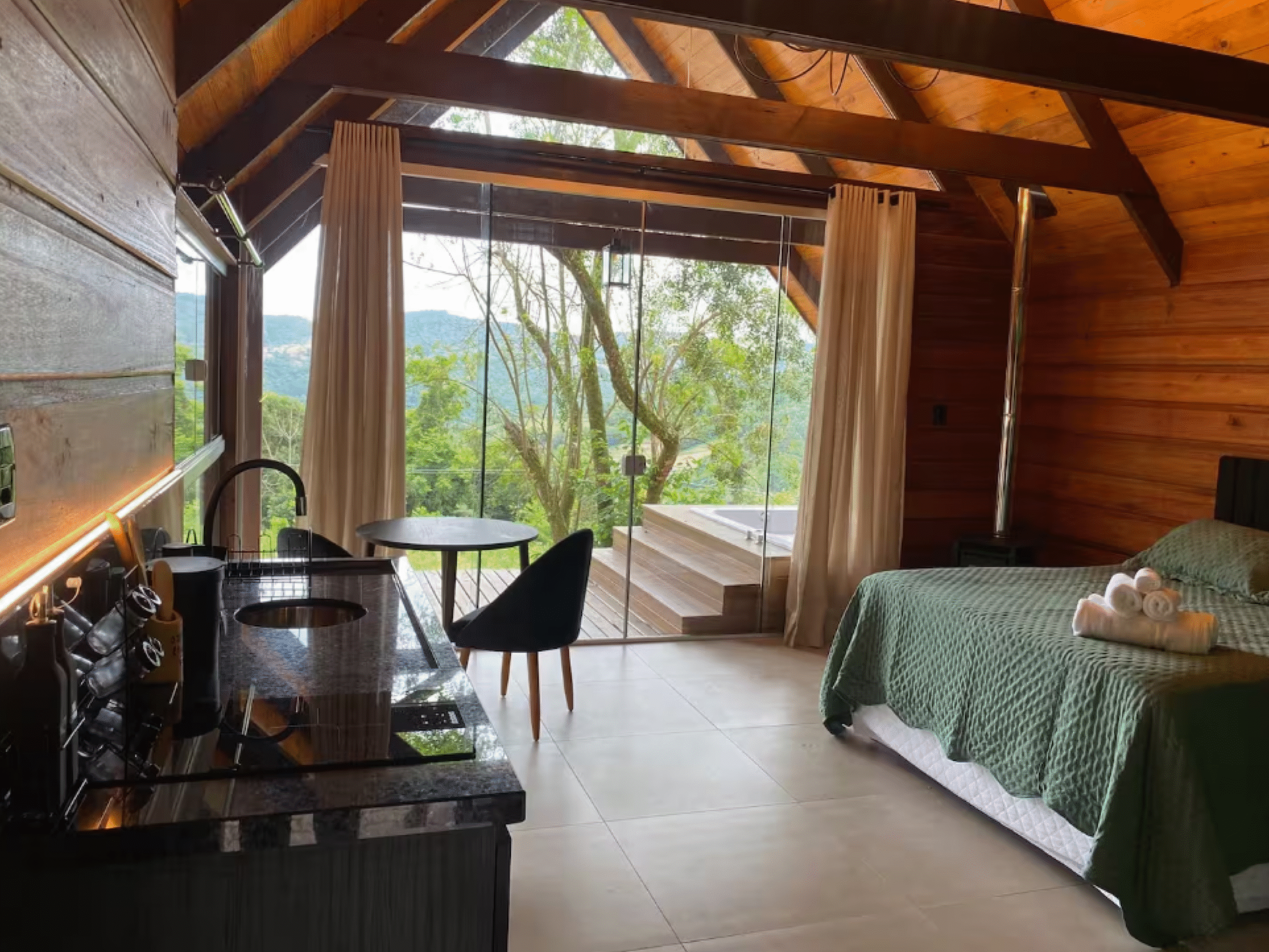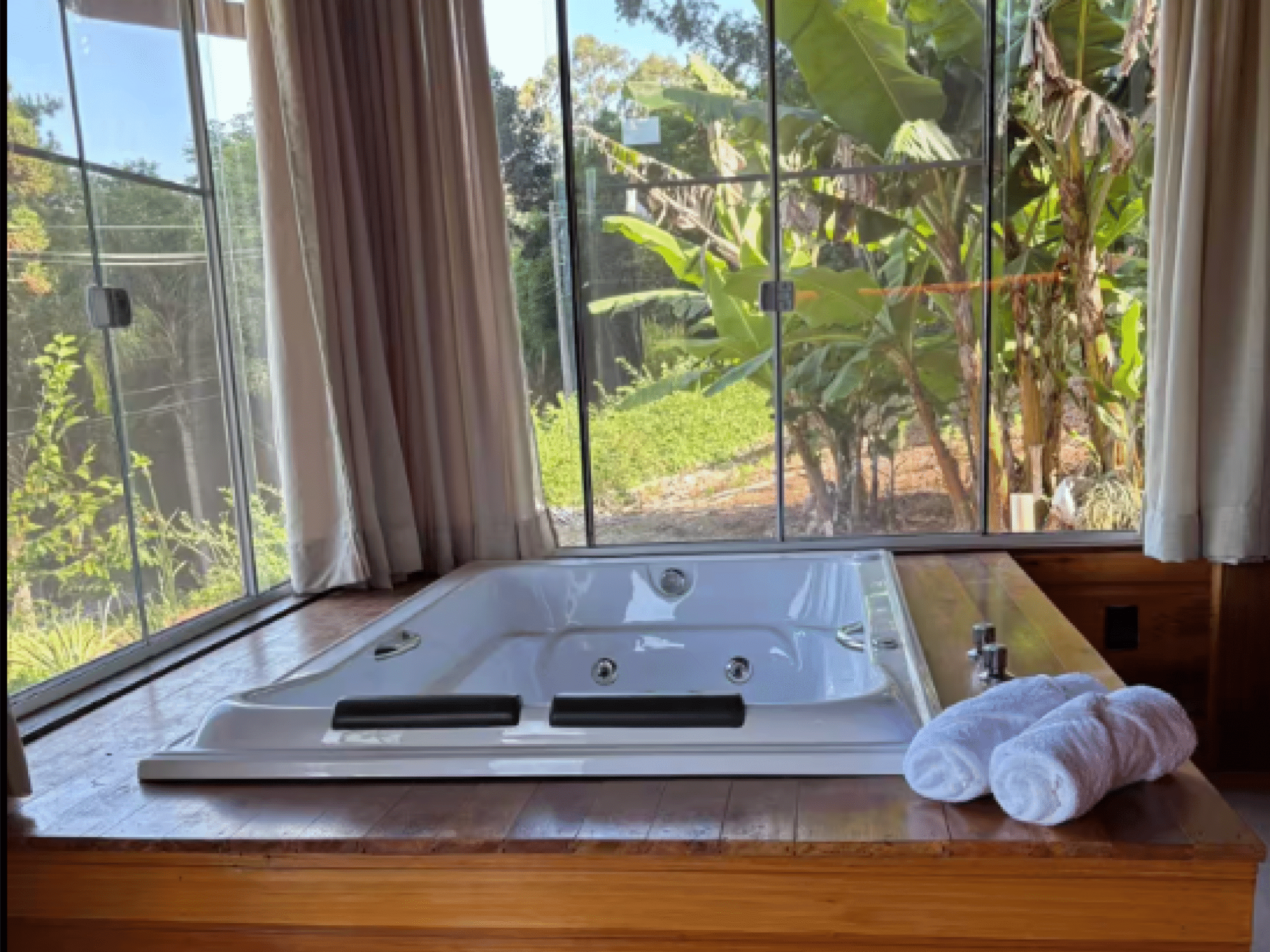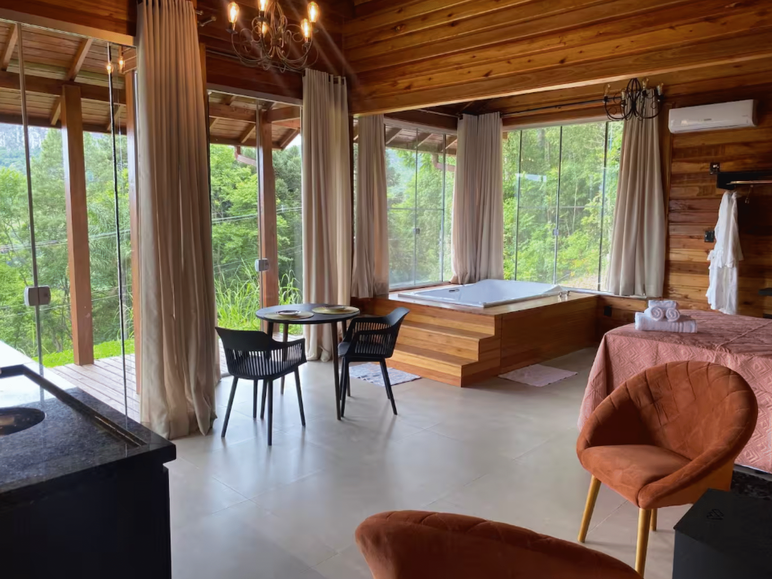 O chalé possui 50 metros quadrados, com banheira de hidromassagem interna e ladeada por vidros de para que a experiência da hospedagem proporcione o contato permanente com o ambiente natural. A madeira usada nas paredes foi retirada da propriedade, seguindo o princípio da sustentabilidade. Ao se hospedar aqui, você sente a magia desse lugar e levará, na alma, essa emoção. Esta unidade possui acessibilidade.